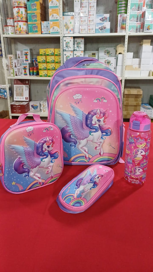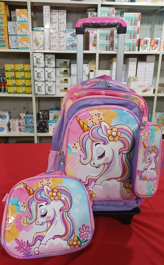 SB004 - 3 pcs 3D set unicorn design: 42 cm school bag with or without wheels + lunch bag + pencil case