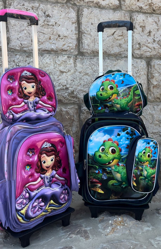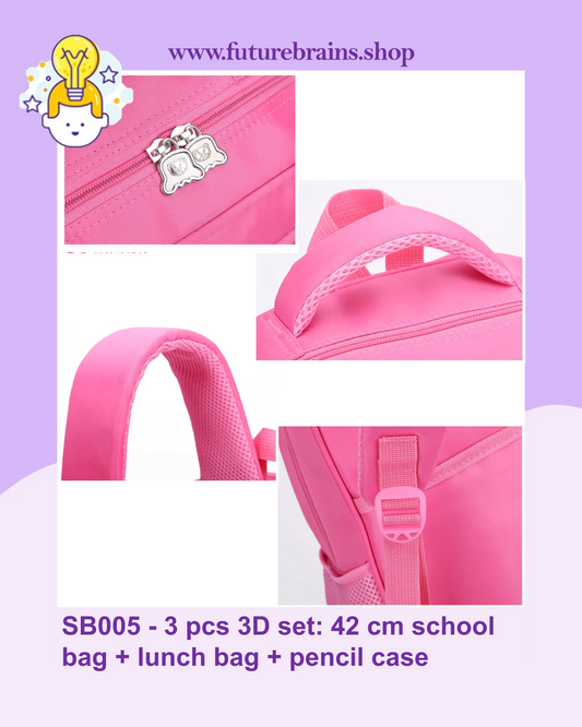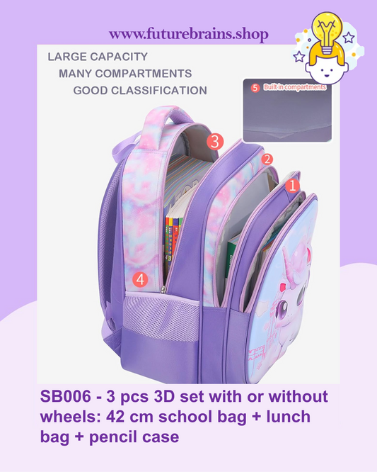 SB006 - 3 pcs 3D set with or without wheels Sophia design: 42 cm school bag + lunch bag + pencil case