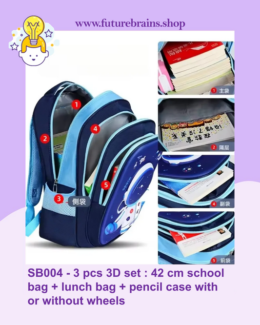 SB006 - 3 pcs 3D set with wheels astronaut design: 42 cm school bag + lunch bag + pencil case