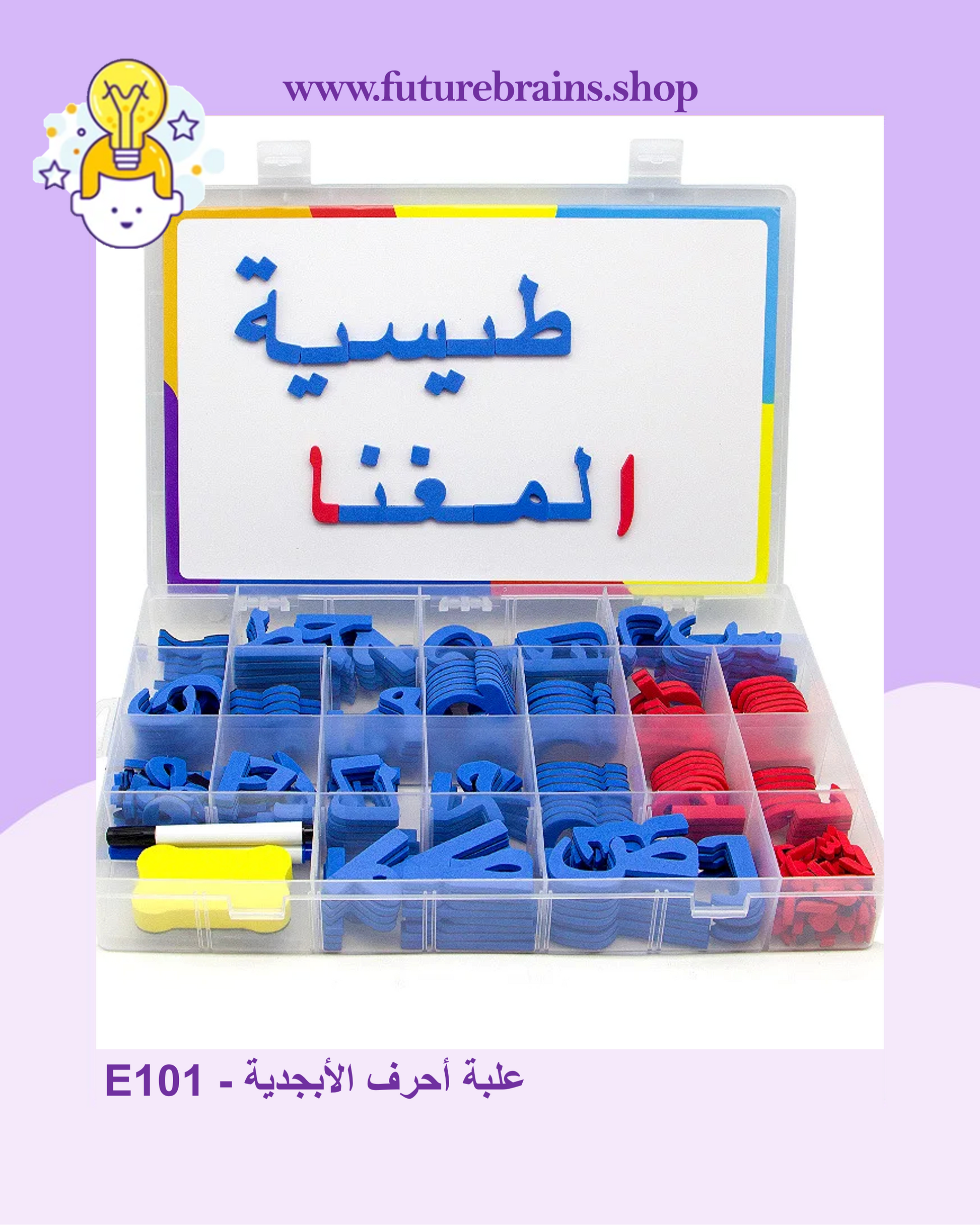 محتويات العلبة: حروف عربية (بجميع مواضعها)، رموز التشكيل، سبورة مغناطيسية مزدوجة الوجه، قلمان (2)، وممسحة.