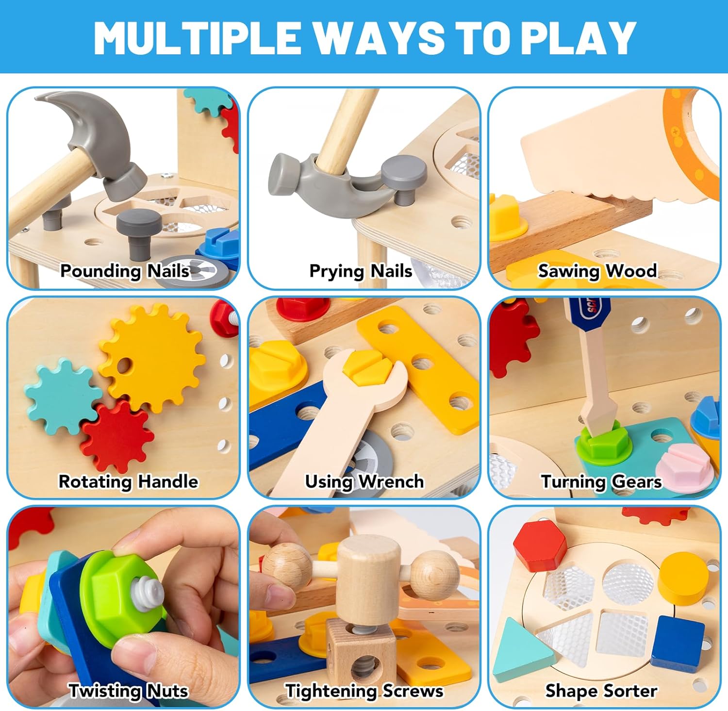 - Comprehensive 91-Piece Set: Includes a wooden bench, hammer, wrench, saw, screwdriver, nails, bolts, nuts, wheels, and colorful building blocks for endless construction possibilities.