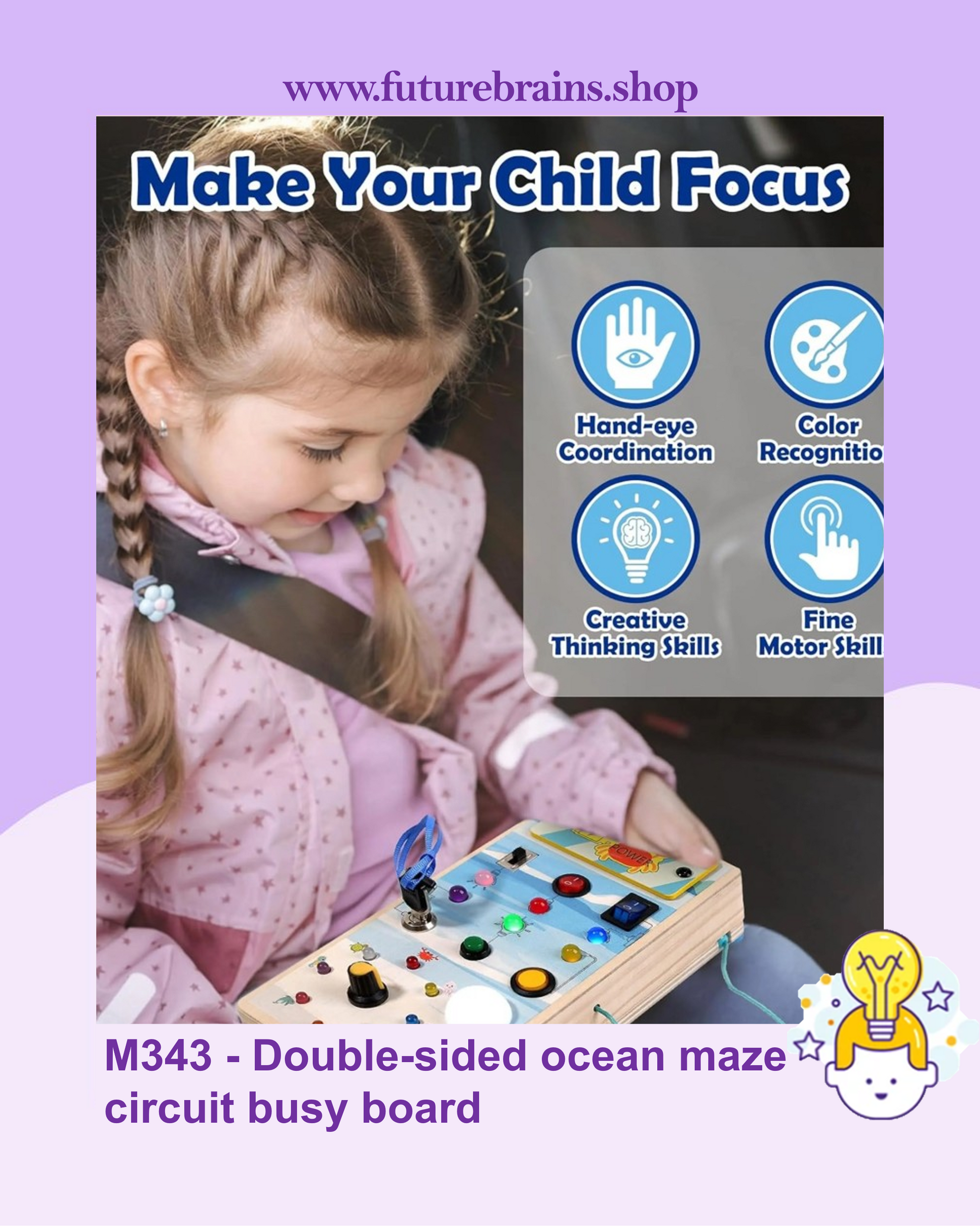 Explore discovery with this 2-sided Montessori Busy Board. Features LED light-up switches and an ocean magnetic maze to boost fine motor skills for ages 1+.