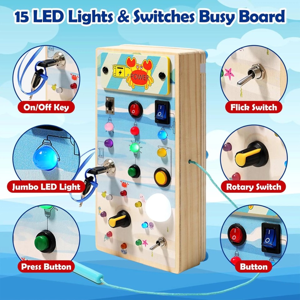 - Side 1 – Light-Up Sensory Board: Includes switches, buttons, and keys that activate colorful LED lights, helping children understand cause and effect while improving fine motor skills.