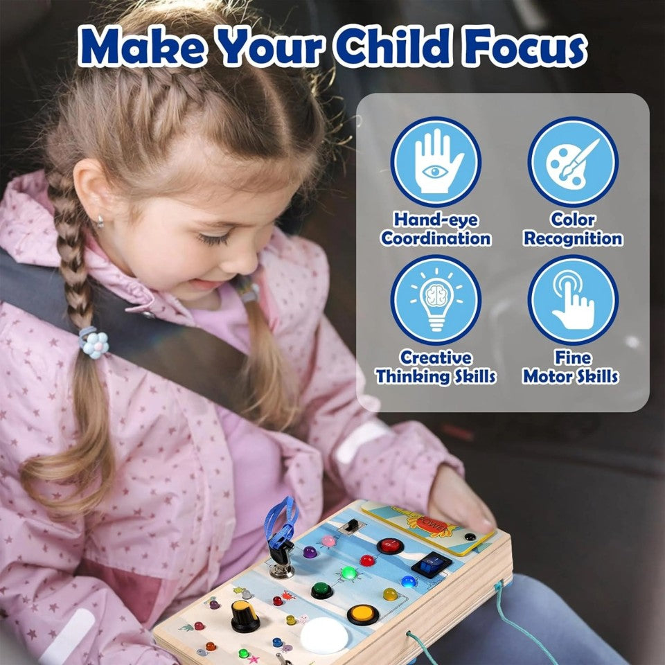 Embark on a world of exploration and discovery with this interactive double-sided wooden busy board! Perfect for curious toddlers, this toy combines sensory play, light exploration, and magnetic maze fun — all in one beautifully crafted Montessori product.