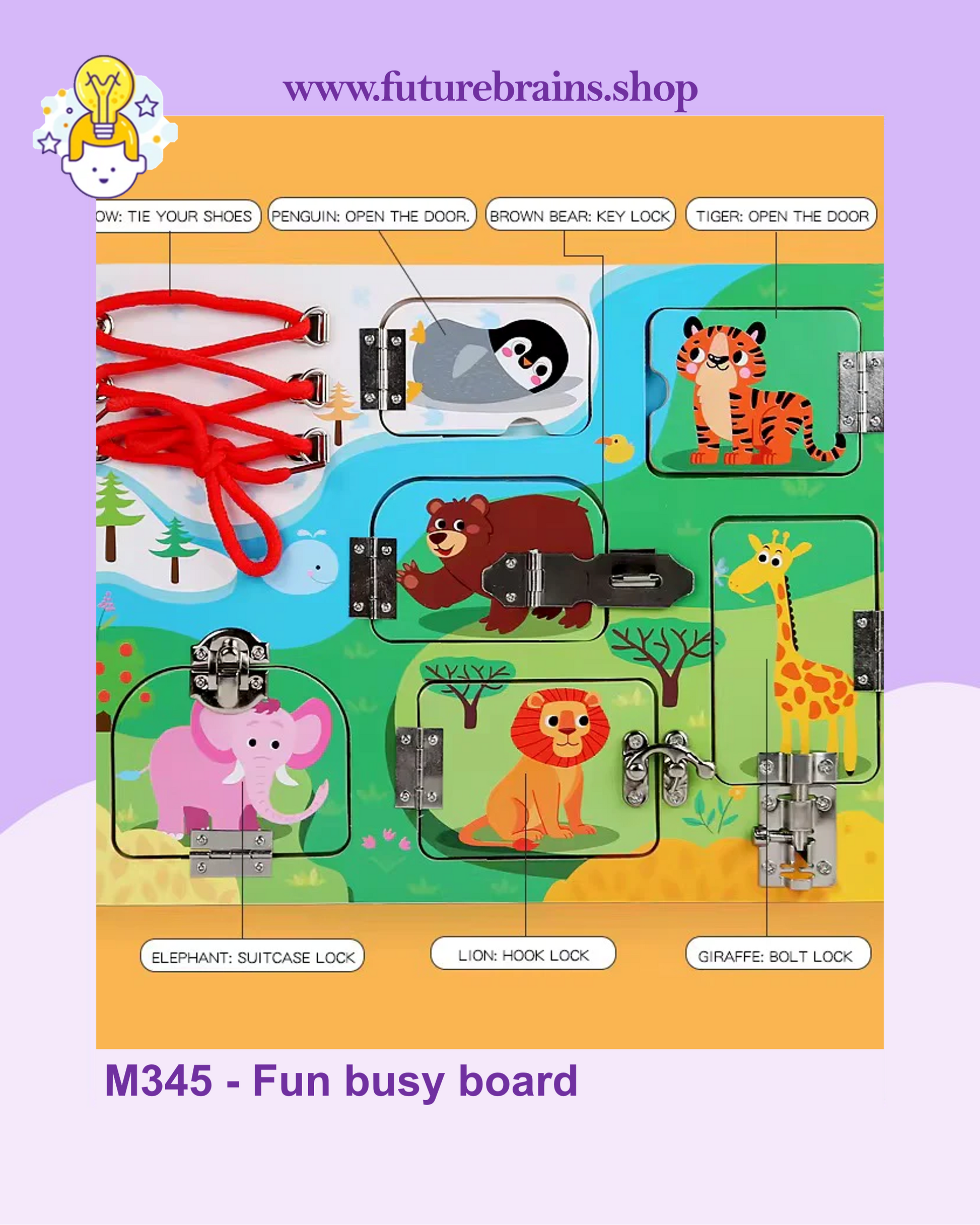 - Interactive Learning Board: Includes door locks, hook latches, key locks, suitcase locks, and shoelaces that encourage practical skill-building through play.