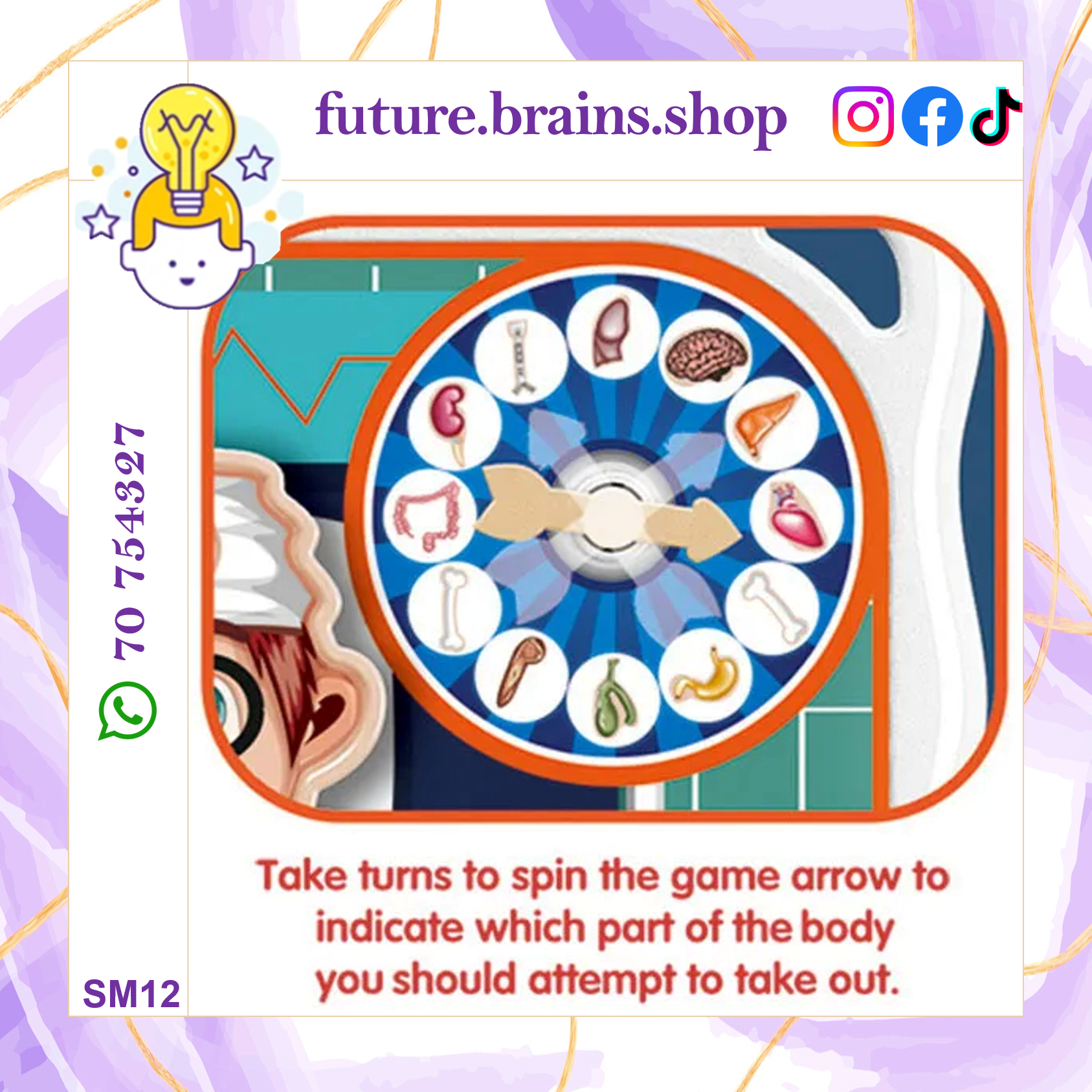 The game board features 12 different places on the human body on which to place the body organs. Spin the wheel, and check what the arrow indicates. Try to carefully pull out a given object from a given part. But be careful! Just touch the patient's surface lightly and it will tremble, start to buzz and the patient will not be saved! Try to save the patient!